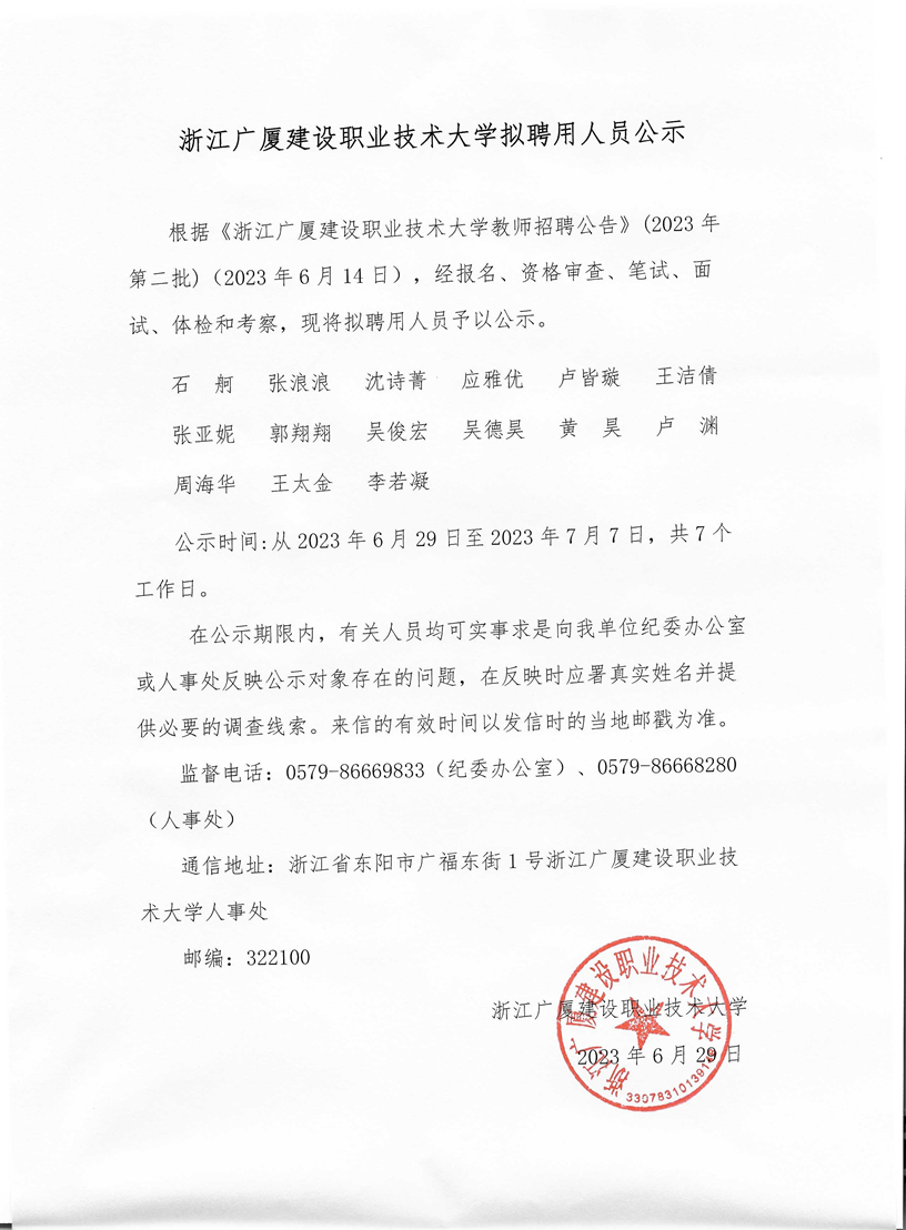 关于浙江广厦建设职业技术大学拟聘用人员的公示