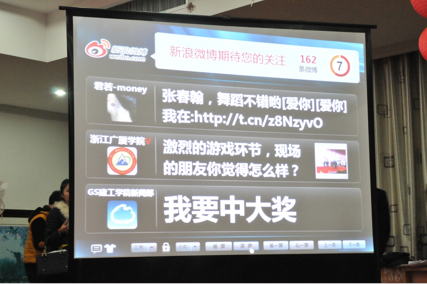 12月31日晚,2014跨年社团茶话会新年晚会在综合楼8楼隆重举行。晚会由DV社、微博社、新闻社、播音主持协会、话剧社、文学社、摄影社七个社团联合组织承办,学院院长许华春,学院党委办公室主任顾旭明,建工分院党总支书记陈华顶,管理分院党总支副书记卢红军等出席。