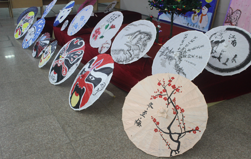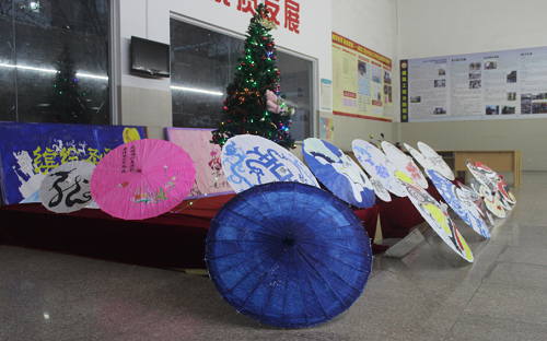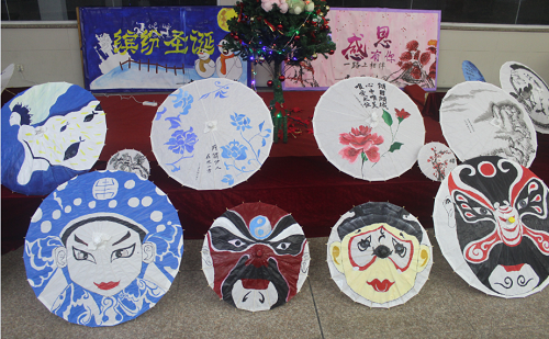 结束了冬至,伴随着西方圣诞节的气氛,校园文化氛围浓郁,参赛选手在油纸伞上发挥出自己的想象。青花瓷、美人鱼、脸谱、大象、冬至梅等图案其中最具中国特色的是青花瓷 、冬至梅、脸谱。东方的特色也正与建工大厅的西方圣诞节气氛形成了中西文化的融合与对比。