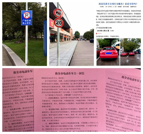 “交通安全你我他,校园文明靠大家”,为东阳市全国文明城市创建和平安校园建设,保卫处近期开展了不文明交通行为整治工作,对交通不文明行为通过现场教育劝导、张贴违停通知单、网上通报曝光等处理方法,交通秩序有明显改善。但是非机动超员乘坐、乱停乱放等现象仍较为严重,希望广大师生积极主动地维护校园道路交通秩序,制止和规劝不文明交通行为。自觉维护校园和谐环境是师生们共同的责任和义务,倡议大家做到以下几点: