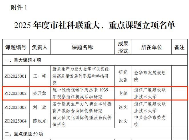 近日,金华市社会科学联合会近日公布2025年度课题立项结果,全市共立项重大课题4项、重点课题59项。浙江广厦建设职业技术大学马克思主义学院在此次课题立项中取得显著成果,斩获1项重大课题和3项重点课题,立项数量与层次均实现突破,创历年新高,标志着学院在马克思主义理论研究与地方文化传承融合领域的学术引领力持续提升,为金华市社科研究高质量发展注入新动能,彰显学院扎根地方、服务发展的科研担当。