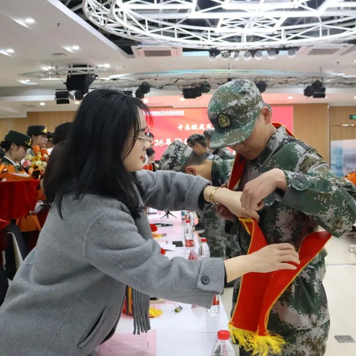 校学工部、人武部副部长许朋汝宣读定兵名单,24名身着统一服装的应征青年依次起立,接受全场掌声致敬。各位领导为青年们佩戴大红花、披挂“光荣入伍”绶带,赠送精心准备的纪念品与鲜花,每一份礼物都承载着母校对学子保家卫国的殷切期盼。